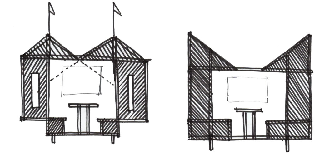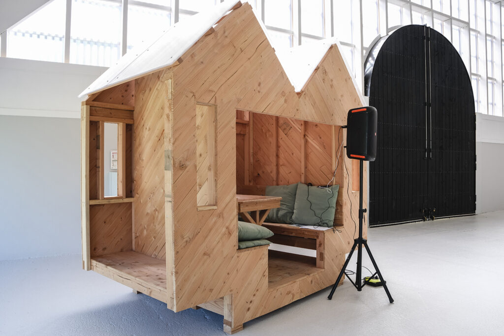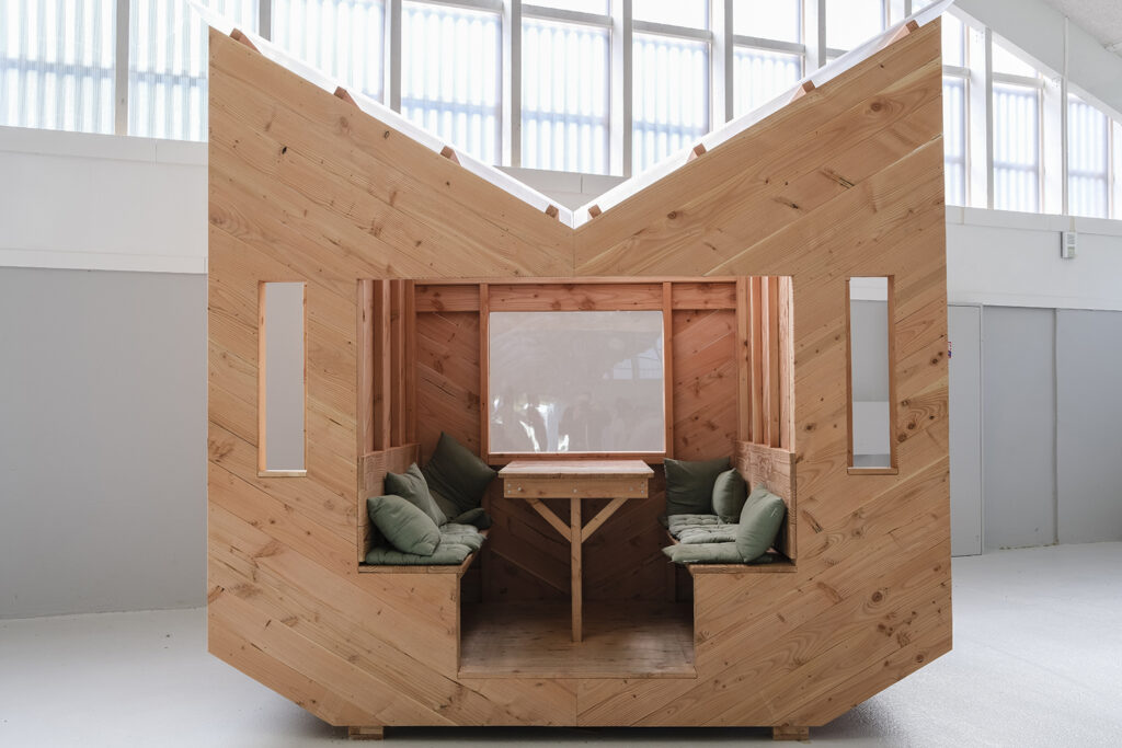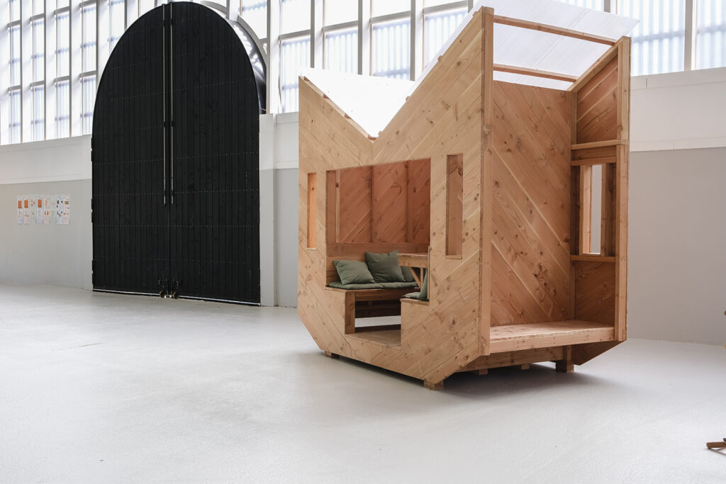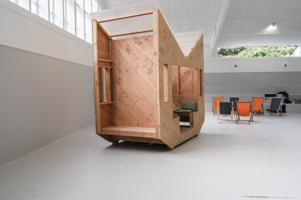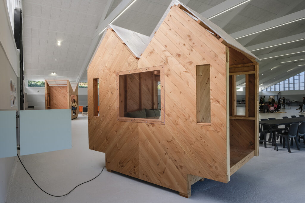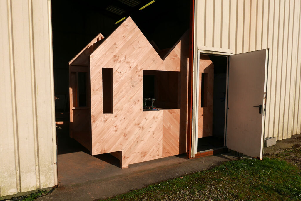 L’ancienne salle de sport du Kelenn a été rénovée en salle polyvalente par Jean-François Madec. Pour la réouverture de ce lieu, la mairie a souhaité deux structures, deux abris dans ce vaste lieu pour accueillir les visiteur et offrir un espace d’intimité pour pique-niquer, jouer, lire. Nous avons proposé deux cabanes mobiles, deux jumelles dont les façades varient, deux visages.