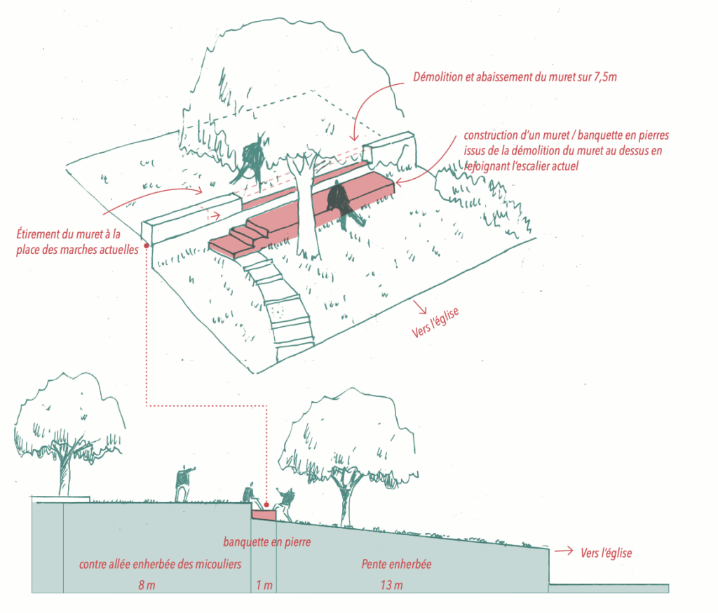 - Mieux indiquer les seuils et entrées sur la place par des redimensionnements de murets et création de calades.