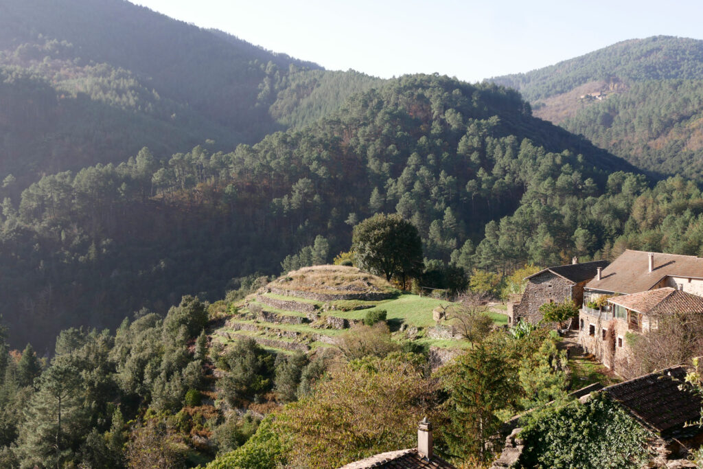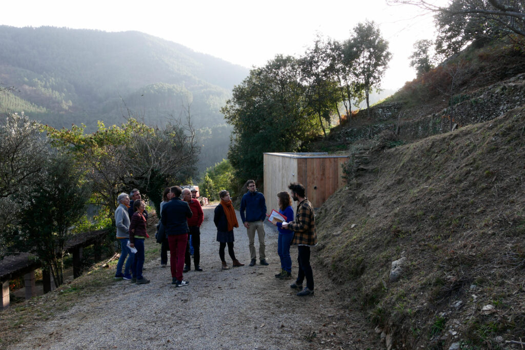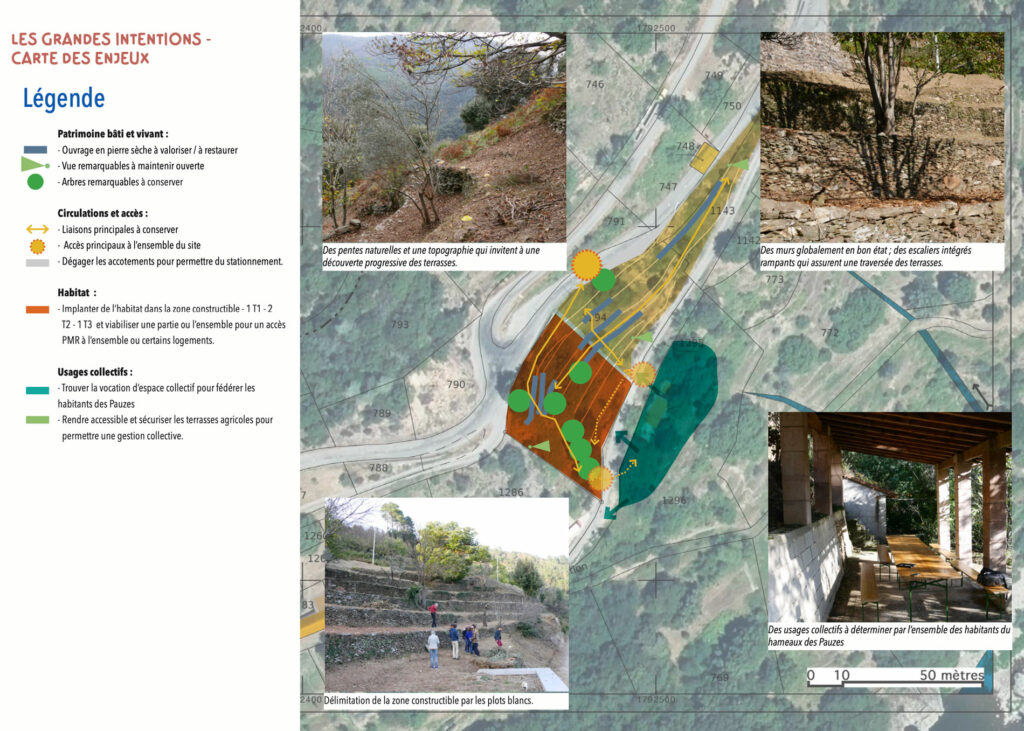 La commune de Beaumont, environ 260 habitants est propriétaire d’une parcelle constructible, dans la continuité du hameau des Pauzes. Cette parcelle en pente est sculptée en 6 à 7 terrasses étroites en pierre sèche, avec une vue ouverte sur la vallée de la Drobie. C’est sur la commune de Beaumont que se trouve le projet d’habitat social innovant des Bogues du Blat porté par l’atelier Construire.